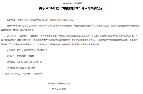 “中國(guó)好技術(shù)”是為深入貫徹落實(shí)黨中央、國(guó)務(wù)院關(guān)于實(shí)施創(chuàng)新驅(qū)動(dòng)發(fā)展戰(zhàn)略和“大眾創(chuàng)業(yè)、萬(wàn)眾創(chuàng)新”的精神,不斷激發(fā)全社會(huì)的創(chuàng)新創(chuàng)業(yè)活力,營(yíng)造全民創(chuàng)新的良好氛圍,由中國(guó)生產(chǎn)力促進(jìn)中心協(xié)會(huì)同國(guó)家相關(guān)機(jī)構(gòu)和企業(yè)共同發(fā)起和舉辦的,此獎(jiǎng)項(xiàng)評(píng)選為每年一次。在2016年度“中國(guó)好技術(shù)”征集中,得到了全國(guó)各級(jí)生產(chǎn)力促進(jìn)中心和相關(guān)企業(yè)的大力支持,共征集科技創(chuàng)新產(chǎn)品和可產(chǎn)業(yè)化技術(shù)成果286項(xiàng),獲得“中國(guó)好技術(shù)”稱號(hào)有108個(gè)項(xiàng)目。評(píng)審“中國(guó)好技術(shù)”這項(xiàng)工作的目的,就是要把蘊(yùn)藏在民間的好技術(shù)變成好產(chǎn)品,把好產(chǎn)品推向國(guó)內(nèi)外市場(chǎng),讓中國(guó)的好產(chǎn)品變成中國(guó)的好品牌,讓中國(guó)的好品牌產(chǎn)生巨大經(jīng)濟(jì)效益和社會(huì)影響。讓“中國(guó)好技術(shù)”服務(wù)和支持“一帶一路”引領(lǐng)下的世界經(jīng)濟(jì)發(fā)展新格局,讓“中國(guó)好技術(shù)”走出國(guó)門(mén),走向世界。