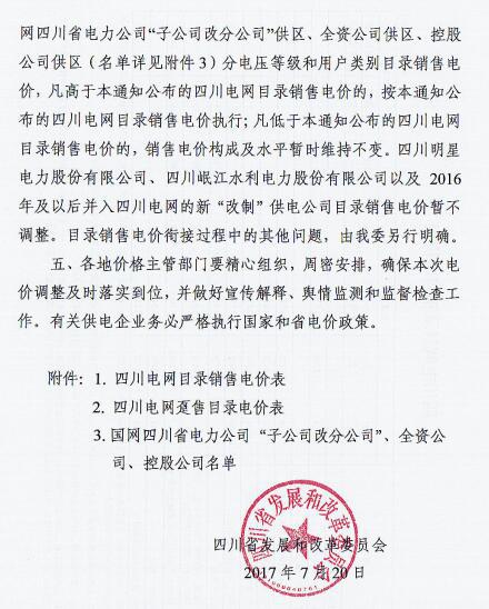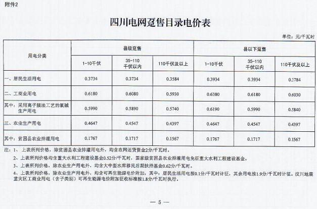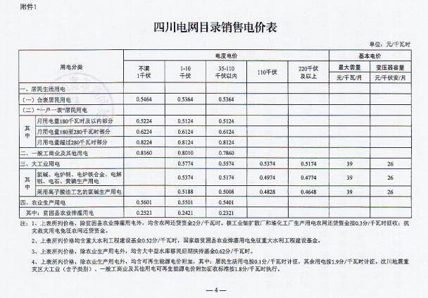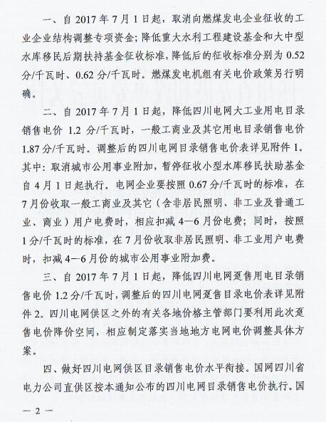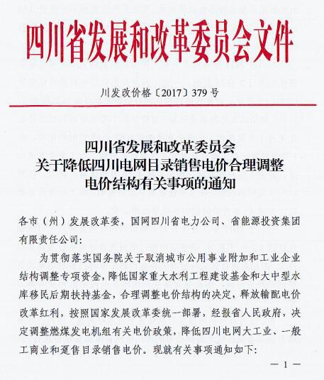 近日,四川省發(fā) 改 委發(fā)布了《四川省發(fā)展和改革委員會關(guān)于降低四川電網(wǎng)目錄銷售電價(jià)合理調(diào)整電價(jià)結(jié)構(gòu)有關(guān)事項(xiàng)的通知》(以下簡稱“通知”)。通知指出,自2017年7月1日起,取消向燃煤發(fā)電企業(yè)征收工業(yè)企業(yè)結(jié)構(gòu)調(diào)整專項(xiàng)資金,降低重大水利工程建設(shè)基金和中大型水庫移民后期扶持基金征收標(biāo)準(zhǔn),降低后的征收標(biāo)準(zhǔn)分別為0.52分/千瓦時(shí)、0.62分/千瓦時(shí)。燃煤發(fā)電機(jī)組有關(guān)電價(jià)政策另行明確。具體情況如下: