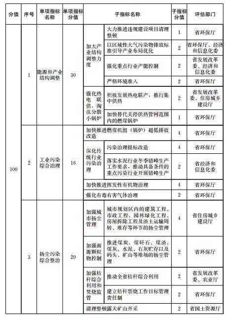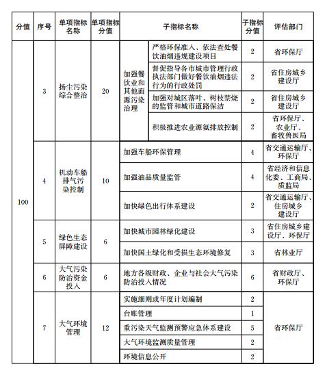 大氣污染防治重點任務(wù)完成情況包括能源和產(chǎn)業(yè)結(jié)構(gòu)調(diào)整、工業(yè)污染綜合治理、揚塵污染綜合整治、機動車船排氣污染控制、綠色生態(tài)屏障建設(shè)、大氣污染防治資金投入、大氣環(huán)境管理等7項指標。大氣污染防治重點任務(wù)完成情況各指標的定義、評估要求和計分方法等由有關(guān)評估部門按照《二期行動計劃》的職責(zé)分工確定,評估部門根據(jù)子指標分值對各市重點任務(wù)進行打分,并向省環(huán)保廳提供評分結(jié)果。評估部門為兩個部門以上的,各評估部門分別打分后取平均值作為本項重點任務(wù)得分。