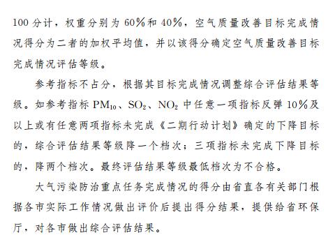 第四條評估采用評分法,空氣質(zhì)量改善目標完成情況和大氣污染防治重點任務(wù)完成情況滿分均按滿分100分計,綜合評估結(jié)果為二者的加權(quán)平均值,權(quán)重分別為60%和40%。評估結(jié)果分為優(yōu)秀、良好、合格、不合格四個等級,其中,評分結(jié)果90分及以上為優(yōu)秀、70分(含)至90分為良好、60分(含)至70分為合格、60分以下為不合格。根據(jù)參考指標目標完成情況調(diào)整綜合評估結(jié)果等級作為最終評估結(jié)果。參考指標PM10、SO2、NO2中任意一項指標反彈10%及以上或有任意兩項指標未完成《二期行動計劃》確定的下降目標的,綜合評估結(jié)果等級降一個檔次;三項指標未完成下降目標的,降兩個檔次。最終評估結(jié)果等級最低檔次為不合格。