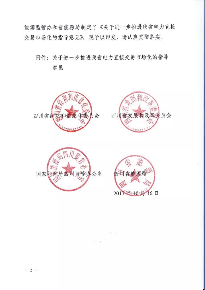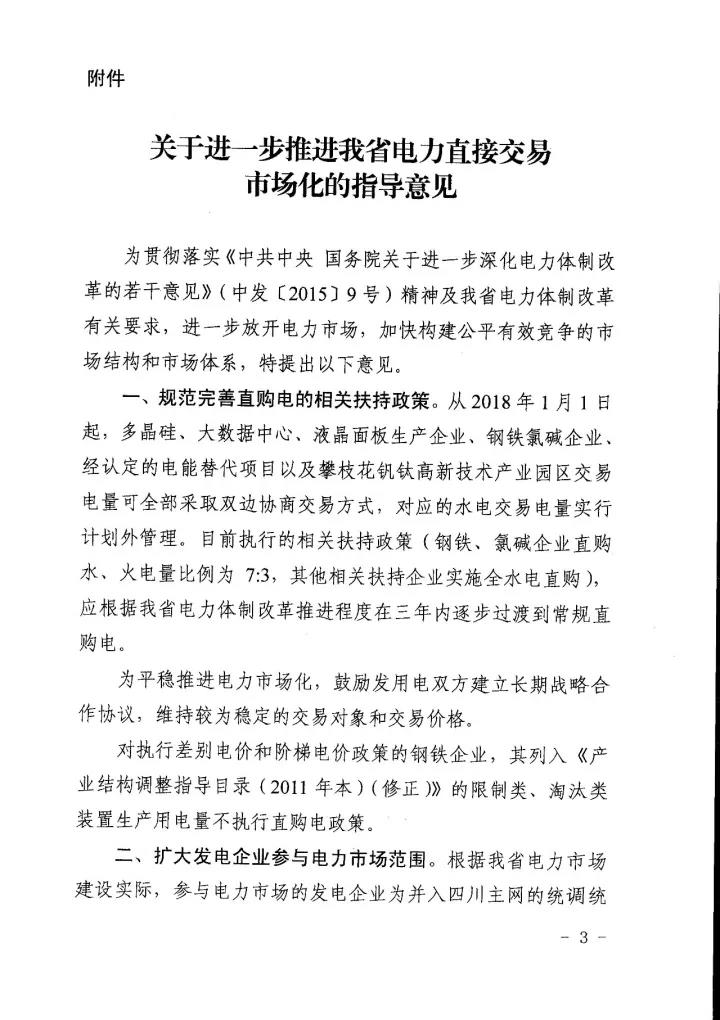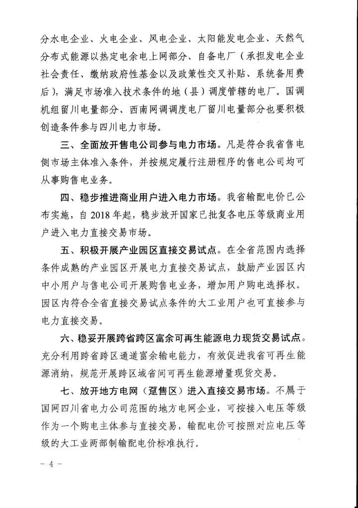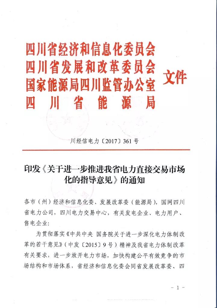 四川省經(jīng)信委、四川省發(fā) 改委、國(guó)家能源局四川監(jiān)管辦、四川省能源局日前聯(lián)合下發(fā)了《關(guān)于進(jìn)一步推進(jìn)我省電力直接交易市場(chǎng)化的指導(dǎo)意見(jiàn)》(以下簡(jiǎn)稱“意見(jiàn)”)。意見(jiàn)中稱,將規(guī)范完善直購(gòu)電的相關(guān)扶持政策,擴(kuò)大發(fā)電企業(yè)參與電力市場(chǎng)范圍,全面放開(kāi)售電公司參與電力市場(chǎng),穩(wěn)步推進(jìn)進(jìn)商業(yè)用戶進(jìn)入電力市場(chǎng),積極開(kāi)展產(chǎn)業(yè)園區(qū)直接交易試點(diǎn),穩(wěn)妥開(kāi)展跨省跨區(qū)富余可再生能源電力現(xiàn)貨交易試點(diǎn),放開(kāi)地方電網(wǎng)(躉售區(qū))進(jìn)入直接交易市場(chǎng),有序推進(jìn)其他特殊行業(yè)企業(yè)完全電力市場(chǎng)化。詳情如下: