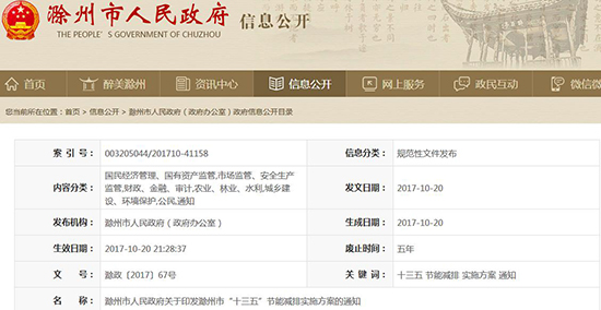 滁州市政府印發(fā)《滁州市“十三五”節(jié)能減排實(shí)施方案》