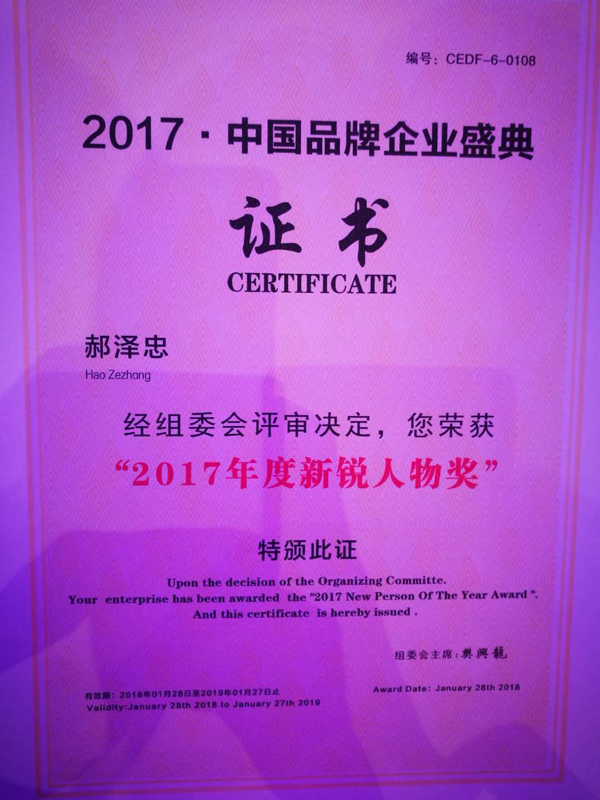 ? ? ? ?在此次盛典上,中科宇杰董事長郝澤忠先生作為一個(gè)走在技術(shù)創(chuàng)新的前列的大型現(xiàn)代化企業(yè)的奠基者和管理者,憑借自己的行業(yè)實(shí)力,從國內(nèi)眾多候選企業(yè)家中脫穎而出,被組委會(huì)授予“2017年度新銳人物獎(jiǎng)”。