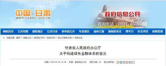 ? ? ? ? 近日,甘肅省人民政府發(fā)布《甘肅省人民政府辦公廳關(guān)于構(gòu)建綠色金融體系的意見》,旨在加快快建立綠色生產(chǎn)和消費的制度安排和政策導(dǎo)向,建立健全綠色低碳循環(huán)發(fā)展的經(jīng)濟體系,發(fā)展綠色金融,推動綠色發(fā)展崛起,提供更多優(yōu)質(zhì)生態(tài)產(chǎn)品以滿足人民日益增長的優(yōu)美生態(tài)環(huán)境需要。詳情如下: