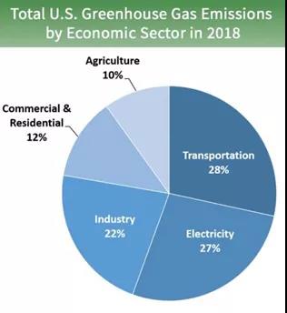看美國(guó)2018年的數(shù)據(jù)也是類似的,交通(28%),發(fā)電(27%),工業(yè)(22%),建筑(12%)