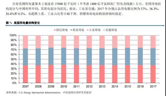 而美國(guó)則是居民和商業(yè)用電合計(jì)超過了70%,工業(yè)用電不到30%。