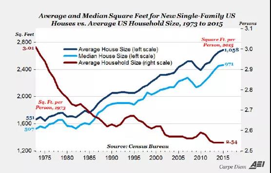 當(dāng)然了,國(guó)內(nèi)家庭各種家用電器也不少,怎么會(huì)跟美利堅(jiān)老百姓有這么大的差距呢?首先我們的城市化水平還不如美國(guó),還有幾億人住在農(nóng)村。其次美國(guó)的人均住房面積大,比歐洲和中國(guó)都大不少,會(huì)帶來對(duì)空調(diào),燈具和其他家電的使用也更為奢侈,下圖是美國(guó)的2015年新建的獨(dú)棟房屋的人均住房面積達(dá)到了1038平方英尺,超過96平米了,注意這可是人均啊,怪不得國(guó)內(nèi)中產(chǎn)和土豪都喜歡去北美買大house。