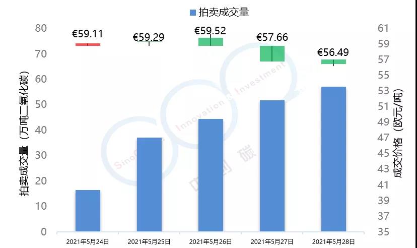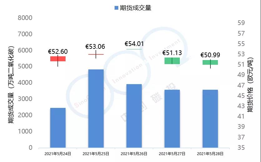 2021年5月24日至5月28日,由于全球能源市場(chǎng)表現(xiàn)較為疲軟,市場(chǎng)投資者對(duì)于配額需求的預(yù)期不景氣,歐盟碳市場(chǎng)在本周總體呈現(xiàn)下跌趨勢(shì),在本周三漲至53.59歐元/噸的頂峰后,隨即下跌近5個(gè)點(diǎn),最終收于50.95歐元/噸,回落至接近本月初水平。英國(guó)碳市場(chǎng)自上周三開市后,在本周迎來(lái)交易的第一個(gè)整周,在短期試探了59.52歐元/噸的碳價(jià)后,英國(guó)碳價(jià)逐步回落至56.49歐元/噸,該趨勢(shì)與歐盟碳市場(chǎng)基本保持一致。本周歐盟碳市場(chǎng)期貨成交量達(dá)到1.84億噸,配額拍賣量為平均每天300萬(wàn)噸左右。英國(guó)碳市場(chǎng)本周拍賣成交量達(dá)到207萬(wàn)噸。據(jù)悉,英國(guó)政府正在考慮增加2021年英國(guó)碳市場(chǎng)配額的拍賣供應(yīng)。