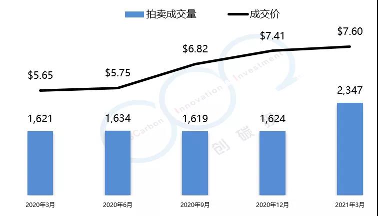 RGGI碳市場(chǎng)的初始配額發(fā)放以拍賣為主,每個(gè)季度舉行一次拍賣。2021年第一季度拍賣成交均價(jià)為$7.60美元,較上一季度漲幅為2.5%。由于弗吉尼亞州的加入,RGGI總成交量創(chuàng)歷史新高,達(dá)到了2347萬(wàn)噸。以下是由中創(chuàng)碳投統(tǒng)計(jì)的RGGI近一年的交易情況。