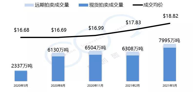 加州-魁北克碳市場(chǎng)的初始配額發(fā)放以拍賣為主,每個(gè)季度舉行一次拍賣。2021年5月的第27次拍賣均價(jià)與總成交量創(chuàng)歷史新高。拍賣均價(jià)為18.82美元,較上一季度漲幅為5.6%,總成交量為7995萬(wàn)噸。以下是由中創(chuàng)碳投統(tǒng)計(jì)的加州-魁北克碳市場(chǎng)近一年的交易情況。