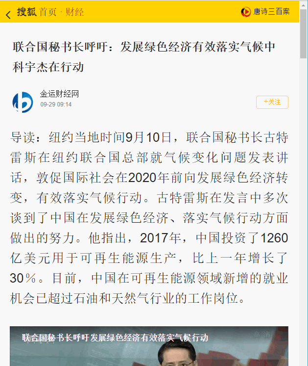 導讀:紐約當?shù)貢r間9月10日,聯(lián)合國秘書長古特雷斯在紐約聯(lián)合國總部就氣候變化問題發(fā)表講話,敦促國際社會在2020年前向發(fā)展綠色經濟轉變,有效落實氣候行動。古特雷斯在發(fā)言中多次談到了中國在發(fā)展綠色經濟、落實氣候行動方面做出的努力。他指出,2017年,中國投資了1260億美元用于可再生能源生產,比上一年增長了30%。目前,中國在可再生能源領域新增的就業(yè)機會已超過石油和天然氣行業(yè)的工作崗位。