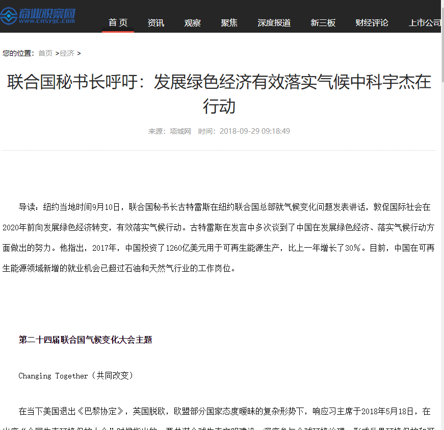 媒體爭相報道:發(fā)展綠色經濟有效落實氣候中科宇杰在行動