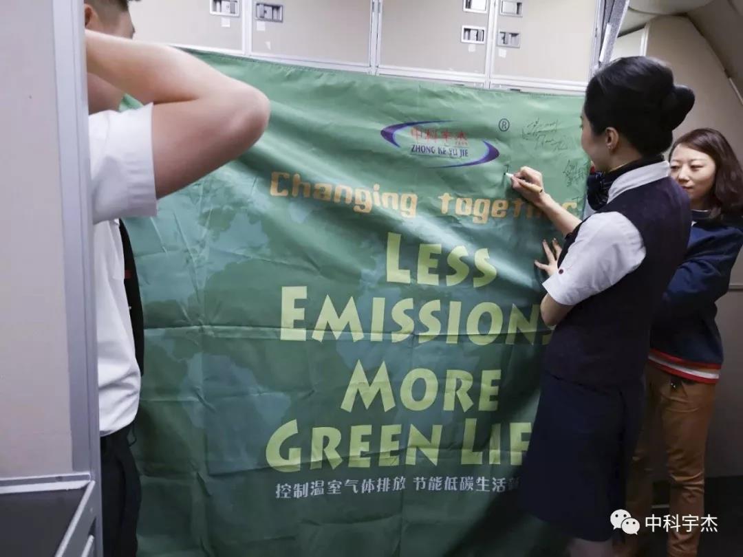 ?本次公益宣傳愛心傳遞活動得到國航CA877機組成員大力支持,據(jù)乘務(wù)長介紹國航一直注重綠色低碳,國航機組成員作為節(jié)能減排的倡導(dǎo)者,保護環(huán)境,人人有責(zé),通過參與中科宇杰本次活動,呼吁全球共同參與,傳遞正能量,積極參與的溫室氣體減排行動?!癓ess Emissions More Green Life”活動,并在的綠色宣傳旗上簽字,節(jié)能低碳我先行,共同參與,共同倡導(dǎo),節(jié)能低碳生活新風(fēng)尚。